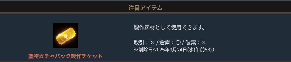 ※一部アイテムは未使用の場合、一定期間が経過すると自動で削除されます。詳しくは各アイテムの詳細をご確認ください。