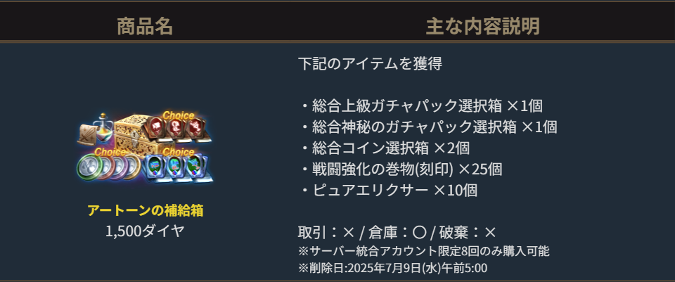 「総合上級ガチャパック選択箱」、「総合神秘のガチャパック選択箱」と一緒に「総合コイン選択箱」、「ピュアエリクサー」などが獲得可能なパッケージです。