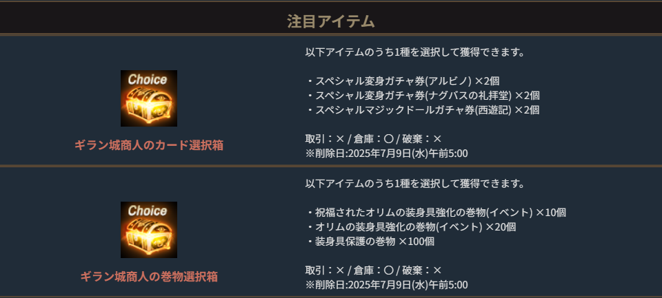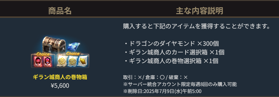 「ドラゴンのダイヤモンド」300個と「ギラン城商人のカード選択箱」1個と一緒に、「装身具保護の巻物」100個などのアイテムから1種選択して獲得できる「ギラン城商人の巻物選択箱」1個が入ったパッケージです。