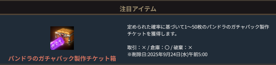 さらに、「パンドラのガチャパック製作チケット箱」から1~50枚獲得できる「パンドラのガチャパック製作チケット」では「最上級ピックアップパック選択箱」や「最上級聖物ガチャパック(イベント)」を製作することができます。