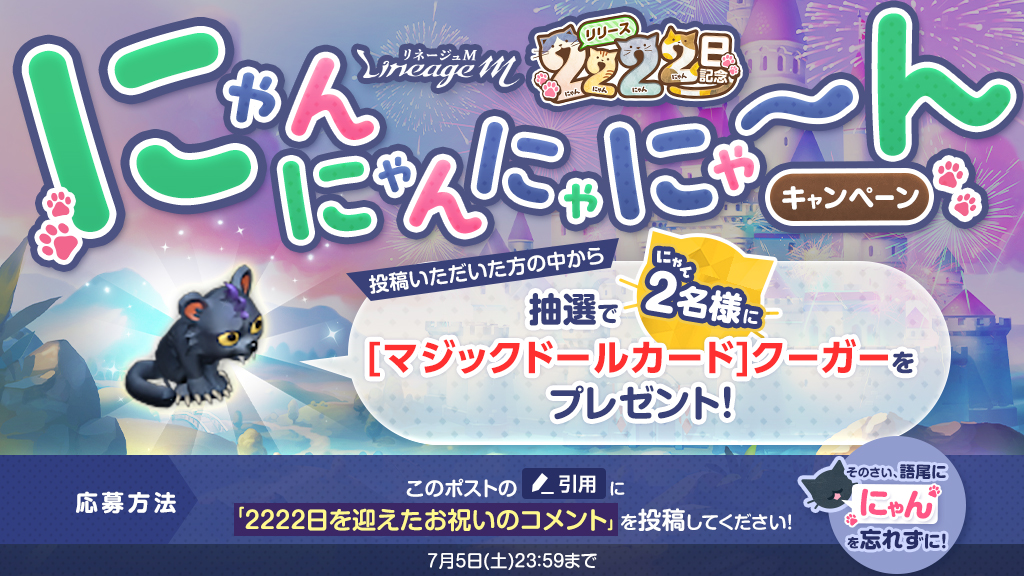 リリース2222日を記念して、2222日を迎えたお祝いのコメントを募集する「リリース2222日記念!にゃんにゃんにゃにゃーんキャンペーン」についてご案内申し上げます。