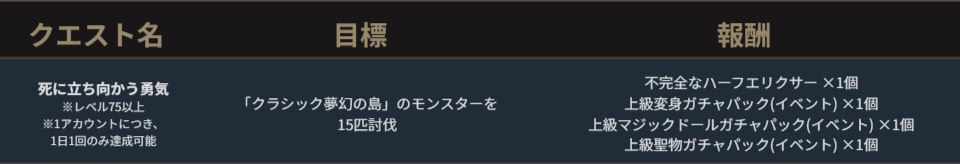 ※期間中、常設で配信されているクエスト「死に立ち向かう勇気」は停止されます。