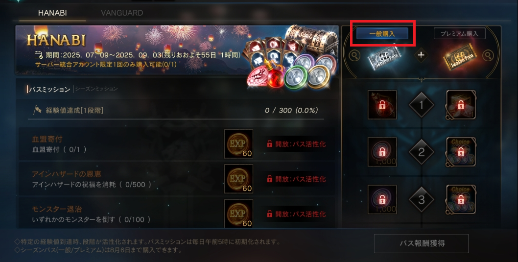 メニューの「パス」画面内、「一般購入」ボタンから「[シーズンパス]HANABI」を交換