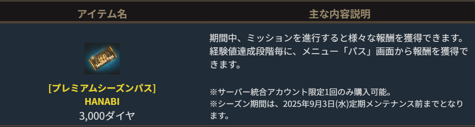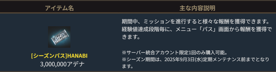 「[シーズンパス]HANABI」は3,000,000アデナ、「[プレミアムシーズンパス]HANABI」は3,000ダイヤでそれぞれ購入できます。