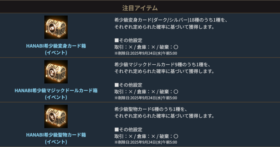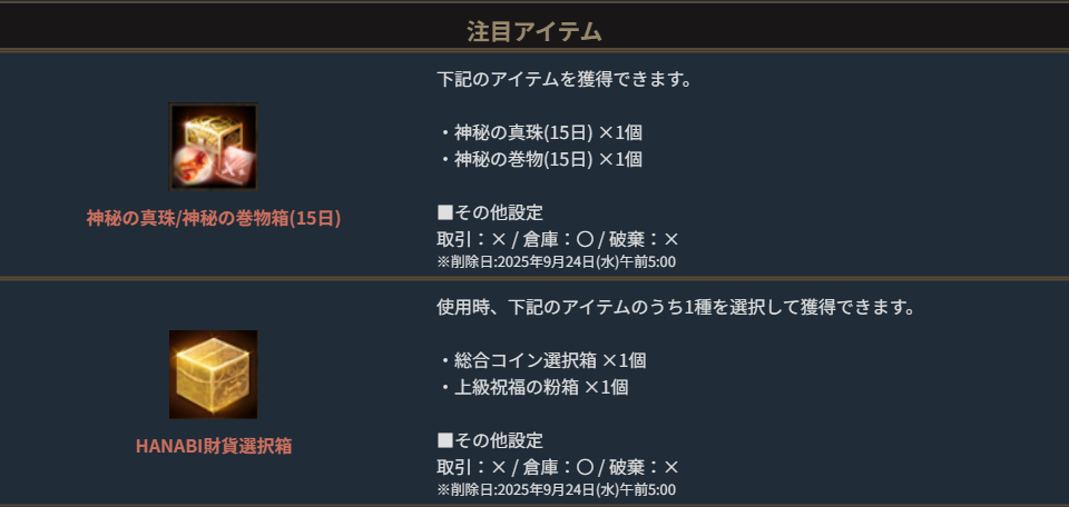 ※一部アイテムが期間終了後も未使用の場合、一定期間が経過すると自動で削除されます。詳しくは各アイテムの詳細をご確認ください。