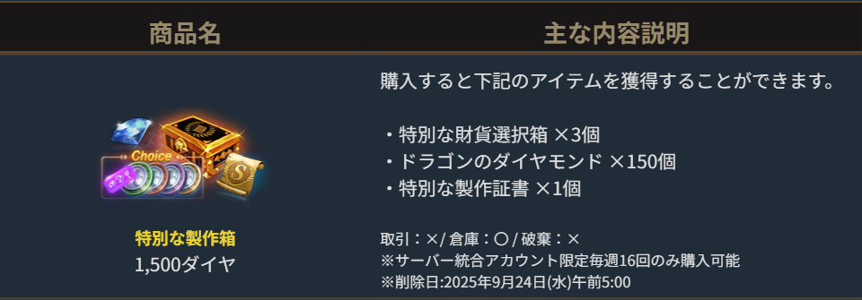「ドラゴンのダイヤモンド」と一緒に、「パンドラのガチャパック製作チケット」、「総合コイン選択箱(5万個)」のうち1種を選択して獲得できる「特別な財貨選択箱」が入ったパッケージです。