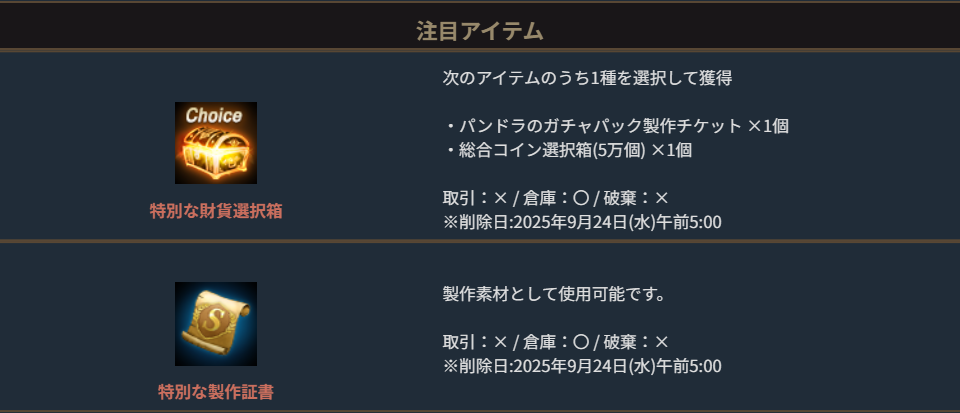 ※一部アイテムは未使用の場合、一定期間が経過すると自動で削除されます。詳細はゲーム内TIPをご確認ください。