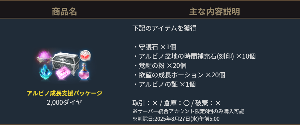 アルビノ盆地での狩りをサポートするアイテムと「守護石」に加え、「アルビノの証」で「アルビノの希少級変身カード箱」などのアイテムが製作できるパッケージです。