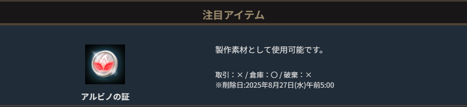 ※一部アイテムは未使用の場合、一定期間が経過すると自動で削除されます。詳しくは各アイテムの詳細をご確認ください。