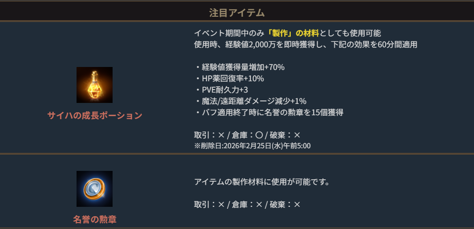 特別な製作の材料として使用可能で、そのまま使用した場合でも様々なバフ効果が得られるアイテムを獲得可能な「サイハの成長ポーション」を含むパッケージが登場しました。