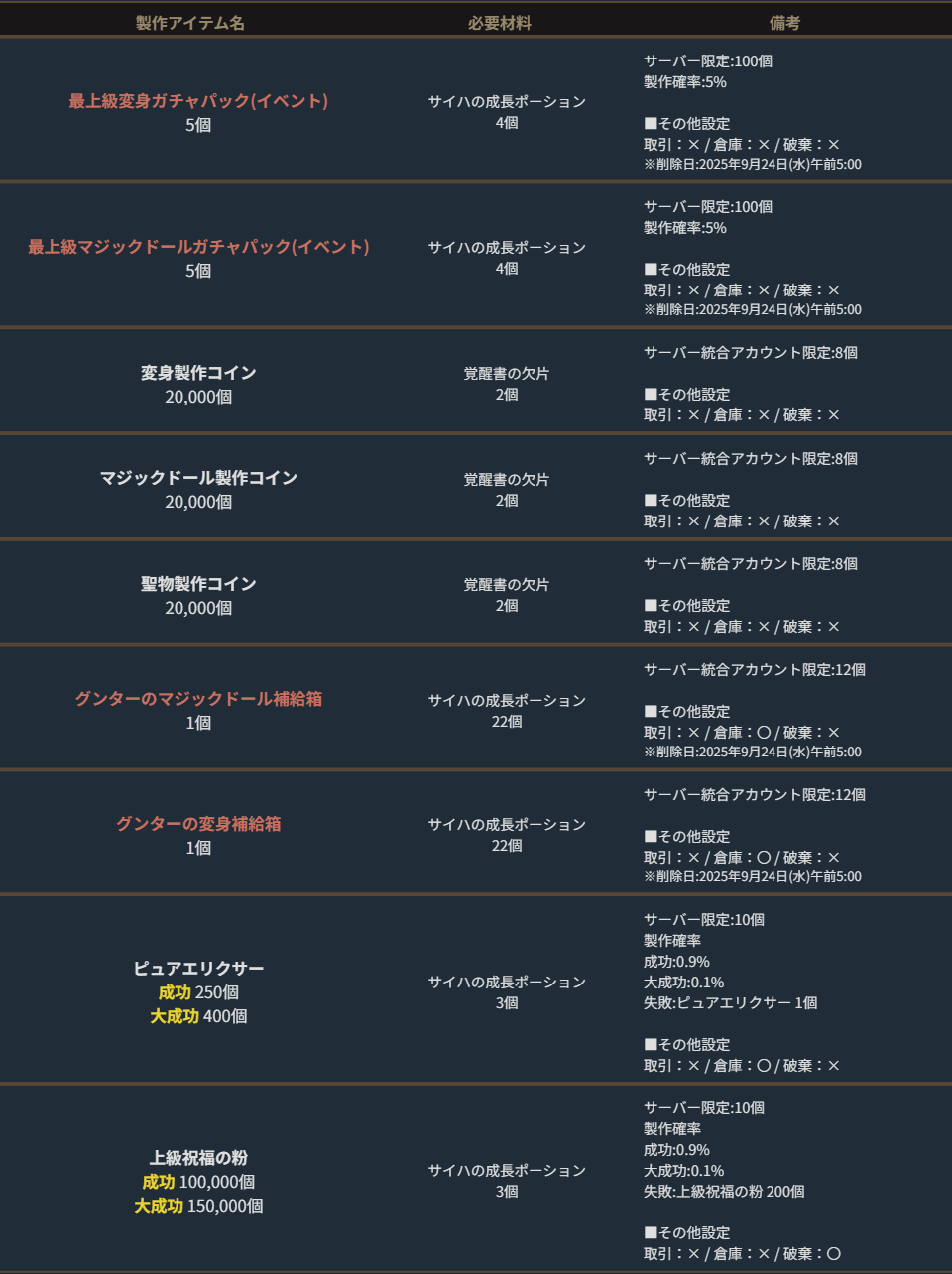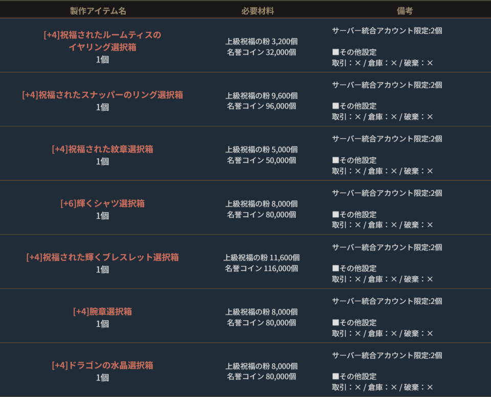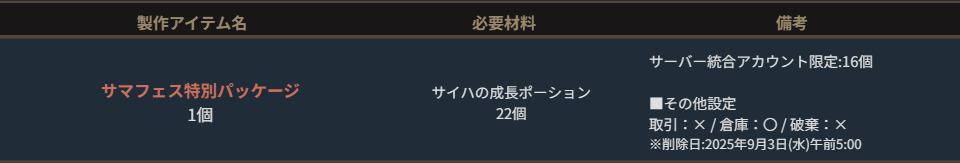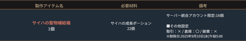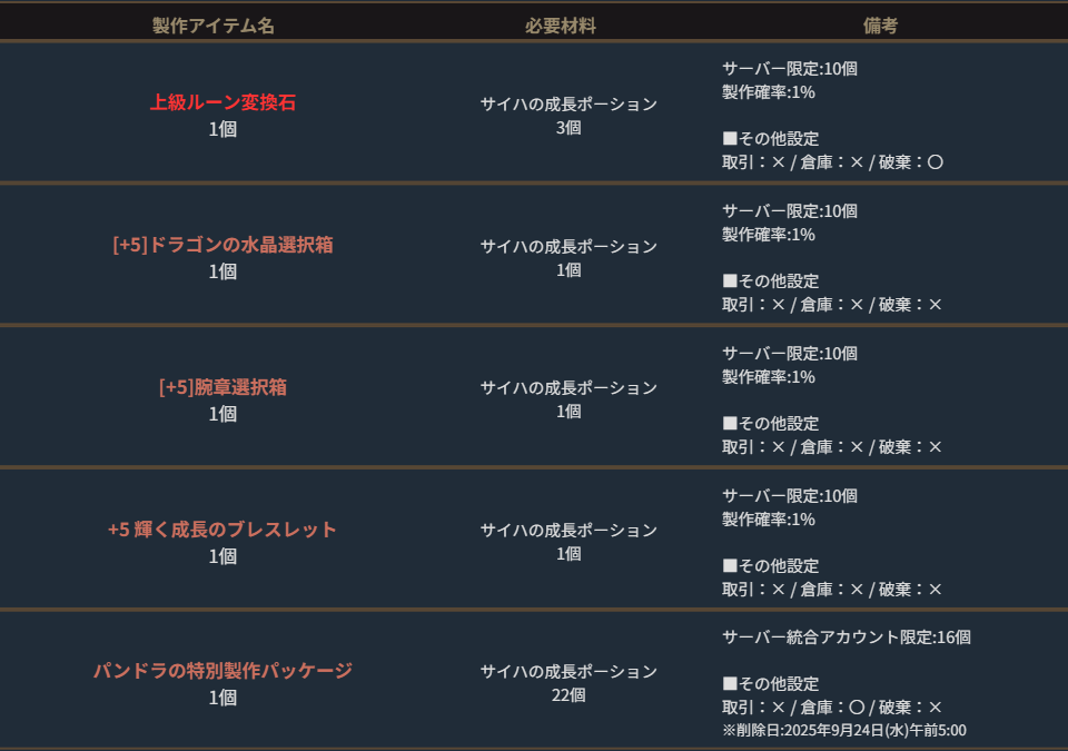 ※サーバー数量限定の製作アイテムは、各サーバーで製作できる数量に上限があります。