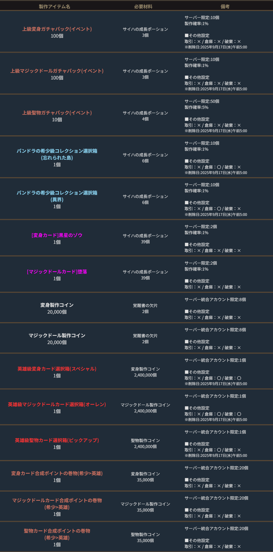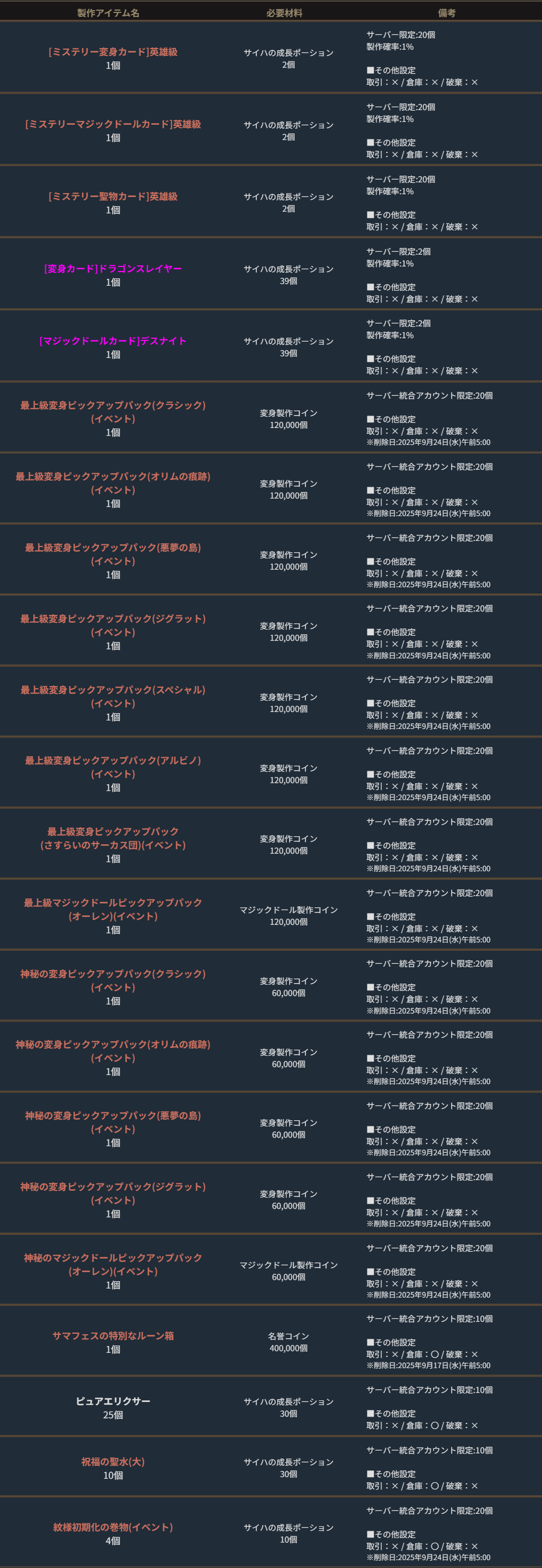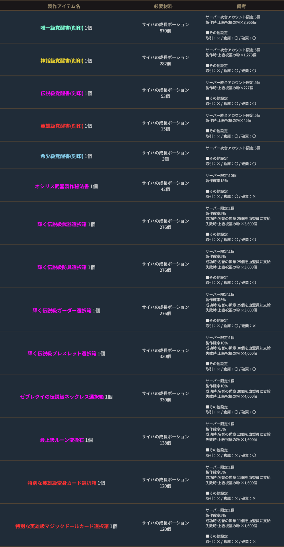 ※サーバー数量限定の製作アイテムは、各サーバーで製作できる数量に上限があります。