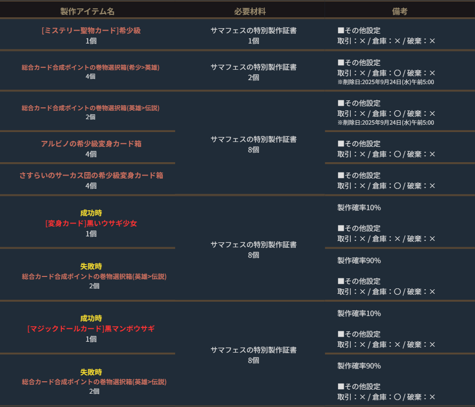 ※製作の確率表につきましては商品ページ⇒「提供割合」にてご確認ください。