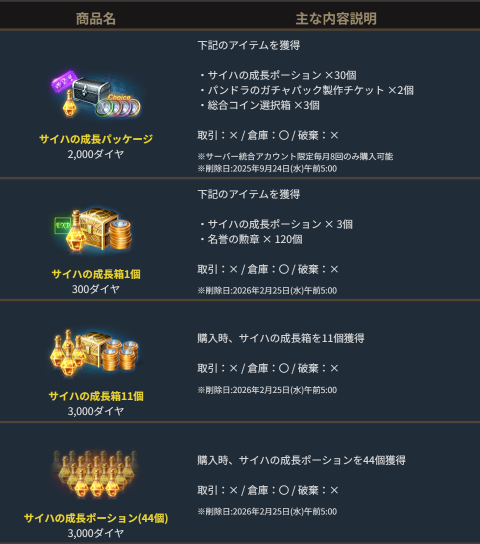 2025年8月20日より、ゲーム内ショップで販売を開始しました「サイハの成長箱」についてご案内します。