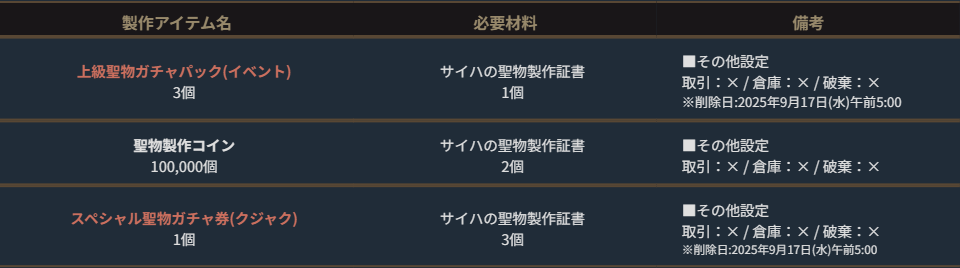 ※期間限定の製作アイテムは、製作可能期間のみゲーム内の「製作」より製作することができます。