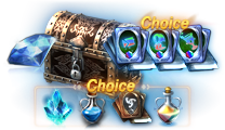 使用すると、下記の中から1種選択して獲得できます。 -祝福の聖水(大) 1個 -守護石2個 -ピュアエリクサー10個 -スキルカードガチャパック箱(イベント) 2個 |
